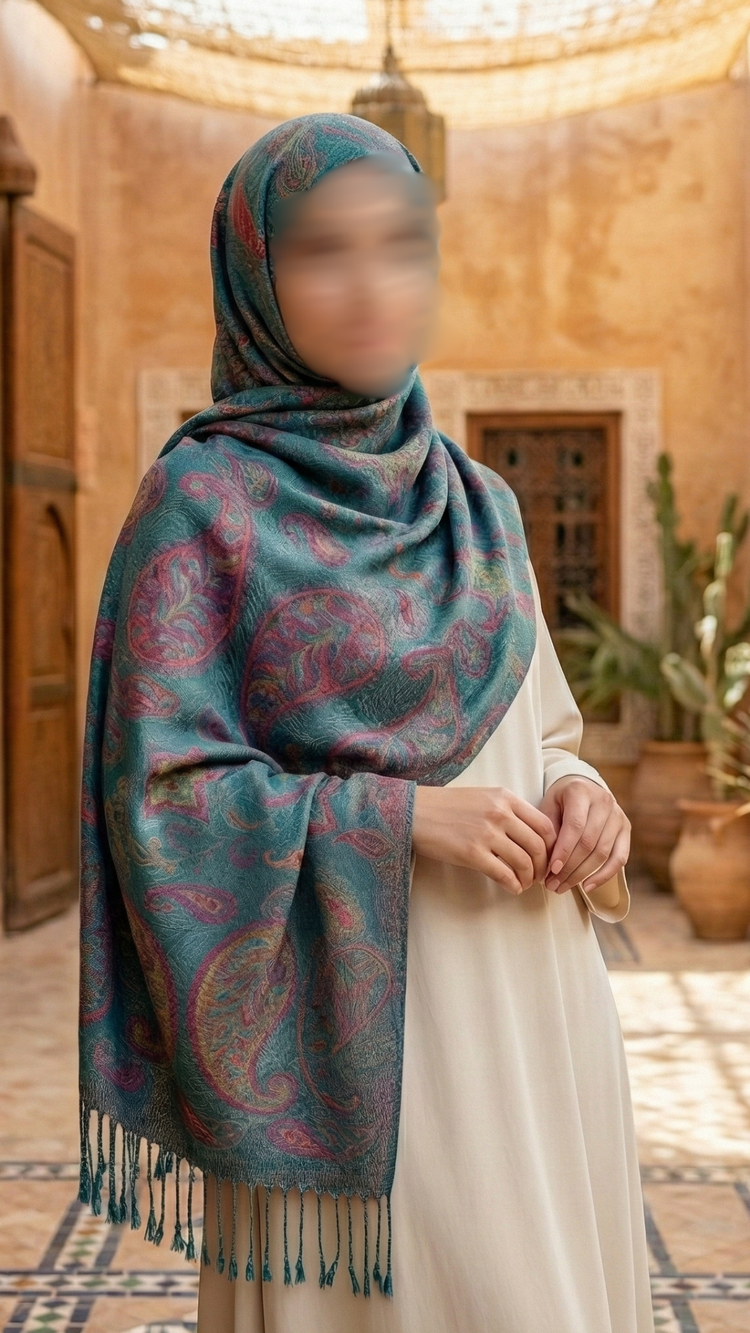 A captivating interplay of exotic hues and bold patterns, Lagoon Lore brings vibrancy, richness, and a spirited elegance to any look. Woven in a balanced blend, this hijab drapes effortlessly while showcasing large-scale paisley swirls layered in deep turquoise, magenta, and soft violet tones. Finished with delicate fringed edges, it feels luxurious yet adventurous—an elevated essential designed to enliven your style without overpowering.