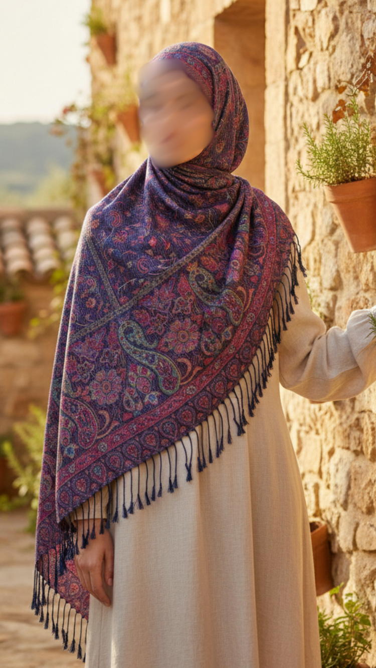 A regal interplay of deep jewel tones and traditional motifs, Midnight Muse brings richness, mystery, and a sophisticated depth to any look. Woven in a balanced blend, this hijab drapes effortlessly while showcasing dense paisley and floral motifs layered in indigo, deep berry, and subtle teal tones. Finished with delicate fringed edges, it feels luxurious yet grounded—an elevated essential designed to define your style without overpowering.